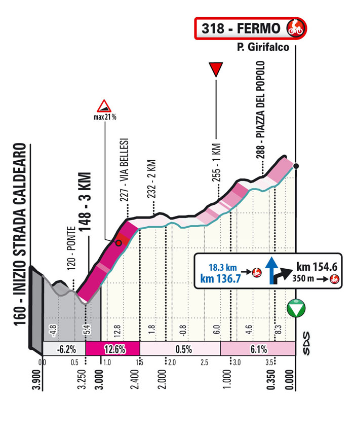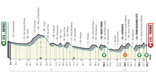 La quinta tappa della Corsa dei due Mari sarà percorsa interamente nelle Marche, regione che ospiterà le ultime tre tappe in programma. Il percorso prevede subito una lunga salita verso il Valico di Pietra Rossa che, pur non essendo classificato come GPM, metterà i corridori su un’ascesa di 12,3 km al 3,4% di pendenza media. Superato il primo ostacolo, la strada continuerà con una serie di saliscendi che porteranno fino al primo GPM di giornata, i 2,3 km al 7,2% del Monte Urano, posto a 50 km dal traguardo. Arrivati a Lido di Fermo, la strada inizierà la breve ascesa verso il traguardo volante di Capodarco, da cui i corridori prenderanno l’ingresso per l’insidioso circuito finale. Si salirà verso Fermo per tre volte, prima fermandosi in Piazza del Popolo, poi passando sul duro strappo verso Madonna d’Ete (2,2 km al 8,5% di pendenza media) a 10 km dal traguardo. A quel punto, dopo un tratto di discesa si inizierà l’ultima e decisiva ascesa verso il traguardo di Fermo, posto in Piazza Girifalco, dopo una scalata di 3,2 km con un tratto iniziale infernale in cui le pendenze supereranno anche il 20%, per poi addolcirsi dopo la flamme rouge.