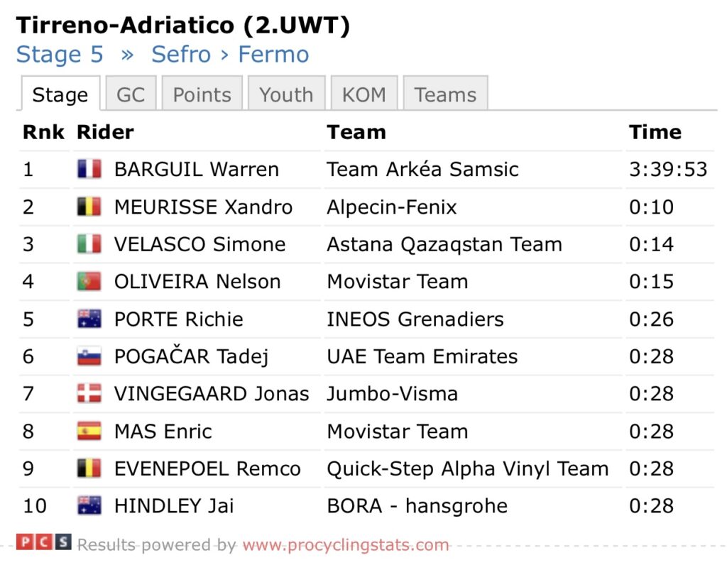 Tappa da fughe doveva essere ed il pronostico ci ha preso anche oggi: nella quarta frazione della Tirreno-Adriatico 2022, con arrivo a Fermo e gli strappi a farla da protagonisti, ad imporsi con un’azione da lontano è il francese dell’Arkea-Samsic Warren Barguil. Resta leader della classifica generale senza patemi Tadej Pogacar.