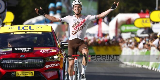 In gruppo l’andatura è gestita dalla UAE di Pogacar, non è un ritmo indiavolato ma fa comunque vittime illustri come Daniel Martinez (Ineos-Grenadiers) ed Aleksandr Vlasov (Bora-Hansgrohe). In testa, nel tratto più duro di salita Pinot cerca di mettersi all’inseguimento di Jungels ma il suo tentativo è generoso ma poco consistente, scollinando dalla testa della corsa a 20”. Il lussemburghese invece, andando regolarmente, va invece a vincere mentre Pinot chiude quarto, scavalcato anche dagli altri due inseguitori. E dopo la curva, fa capolino la maglia gialla: accelerata del gruppo ed un mai domo Pogacar ha scattato negli ultimi metri per guadagnare qualche secondo sugli avversari. Vingegaard gli rimane attaccato, ma lo sloveno riesce ad imporre lo strappo mettendo altri tre secondi tra sé e tutti gli altri.