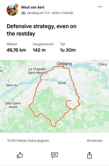Uno dei corridori chiave nel mantenere Vingegaard in sicurezza durante quella tappa difficile è stato Wout van Aert. Il belga, in risposta alle critiche rivolte a lui e ai suoi compagni di squadra, ha pubblicato sul suo account Strava ufficiale una pedalata di allenamento durante il primo giorno di riposo del Tour de France 2024, accompagnandola con una didascalia scherzosa: