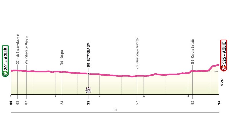 Cronometro individuale breve, molto veloce e adatta agli specialisti contro il tempo. Si compone di lunghi tratti rettilinei raccordati da alcune curve. Unica piccola difficoltà la rampa finale (4% medio) che conduce al Castello di Agliè.