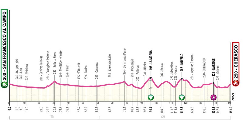 Tappa relativamente pianeggiante nella prima parte e poi mossa e articolata fino all’arrivo. Si contorna la città di Torino toccando alcune località del suo hinterland come Settimo Torinese e Chieri. Si prosegue poi verso sud fino a trovare le colline dell’Albese dove si scalano La Morra e Novello prima di giungere al circuito finale di 18 km (1 giro) che tocca oltre a Cherasco anche Narzole e il fondovalle del Tanaro. Nel 2010 sullo stesso arrivo Philippe Gilbert trionfò in quell’edizione del Gran Piemonte.