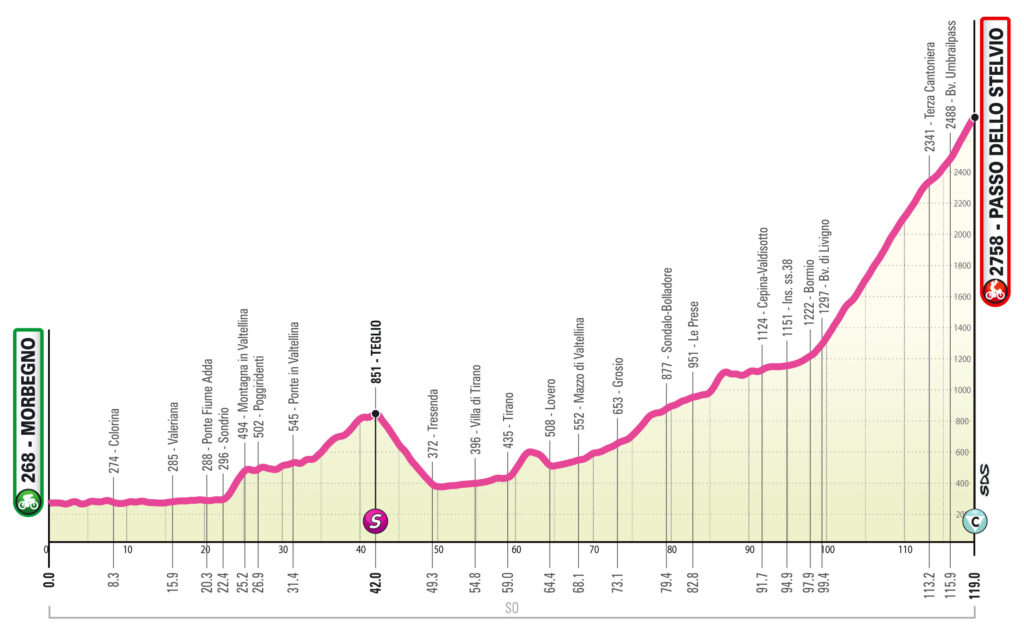 Tappa di alta montagna molto dura che designerà la prima bozza, potenzialmente definitiva della classifica generale. Da Morbegno si segue il corso dell’Adda fino a Sondrio dove si sale sulla strada panoramica attraversando località importanti per il ciclismo come Poggiridenti. Passaggio da Teglio (che dà il nome alla valle) e poi lunga risalita fino a Bormio attraverso Tirano, Mazzo di Valtellina e Valdisotto. Salita finale di 22 km al 7% medio con oltre 30 tornanti.