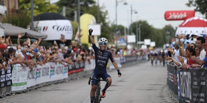 Proprio nel tratto finale in pianura a rilanciare l’azione con estrema decisione è stato il marchigiano Riccardo Ciuccarelli (Biesse Arvedi) che, cogliendo tutti di sorpresa, è riuscito ad avvantaggiarsi e resistere all’inseguimento dei migliori di giornata presentandosi in perfetta solitudine sulla retta d’arrivo di Poggiana. Va a lui, dunque, la maglia gialla della GSG mentre completano il podio con la maglia nera Elettrica B&C – Elettrone – Enrev il britannico Askey Lewis che conquista il secondo posto e il tricolore della cronometro, Filippo Baroncini (Colpack Ballan) che ha indossato la maglia arancione Surfaces.
