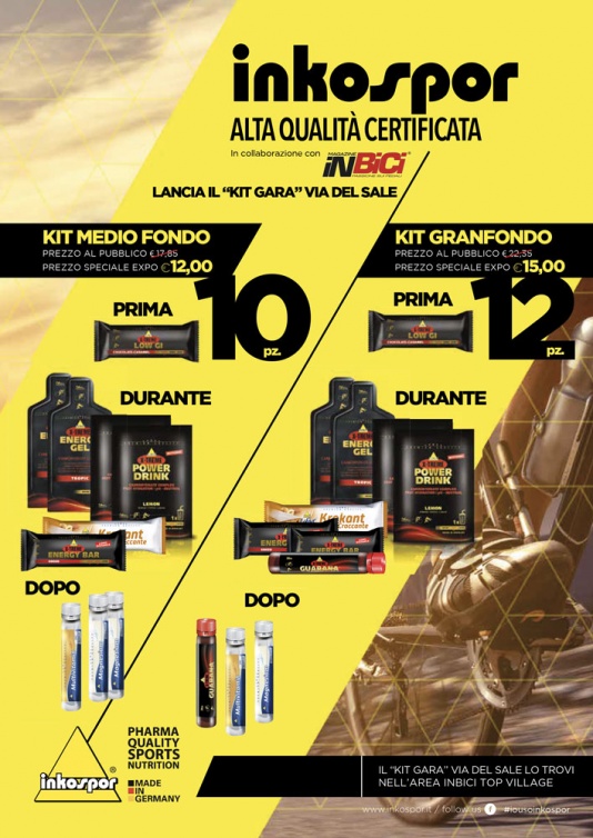 In una gara impegnativa come la Via del Sale, l’alimentazione calibrata diventa una componente fondamentale. Per questo, l’azienda Inkospor, leader in Europa sul mercato degli integratori, ha deciso di essere presente alla 23esima edizione della Gran Fondo di Cervia.