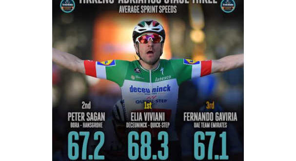 Secondo i dati resi noti da Velon, nello sprint che si è disputato ieri a Foligno i primi tre corridori classificati hanno toccato delle velocità pazzesche. Gli ultimi 350 metri sono stati coperti in soli 20 secondi, con Elia Viviani, vincitore di tappa, che ha toccato la velocità massima di 74,2 km/h e una velocità media di 68,3 km/h nel corso dello sprint.