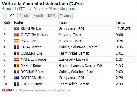 La giornata era cominciata con lo spagnolo Enric Mas primo in classifica: lo scalatore della Movistar partiva con gli sfavori del pronostico ma la sua prestazione fino all’ultimo chilometro era risultata convincente, ma la sfortuna lo ha clamorosamente colpito sul rettilineo conclusivo, complice una foratura alla ruota anteriore quando mancavano circa 500 metri. Costretto quasi a fermarsi, ha proseguito fino alla linea di arrivo quasi a passo d’uomo, perdendo 1’26” da Küng, che ha concluso la prova in 16’13”. Si tratta della terza vittoria parziale per la Groupama-FDJ alla Volta Valenciana.