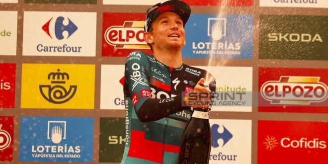 Esulta Lennard Kämna nella nona tappa della Vuelta a España 2023. Il tedesco della BORA-hansgrohe è stato bravo a inserirsi nella giusta fuga e ha poi conquistato il successo dopo aver fatto il vuoto sulla salita finale sull’Alto Caravaca da la Cruz. Per il classe 1996 si tratta della nona vittoria in carriera, la prima alla Vuelta.