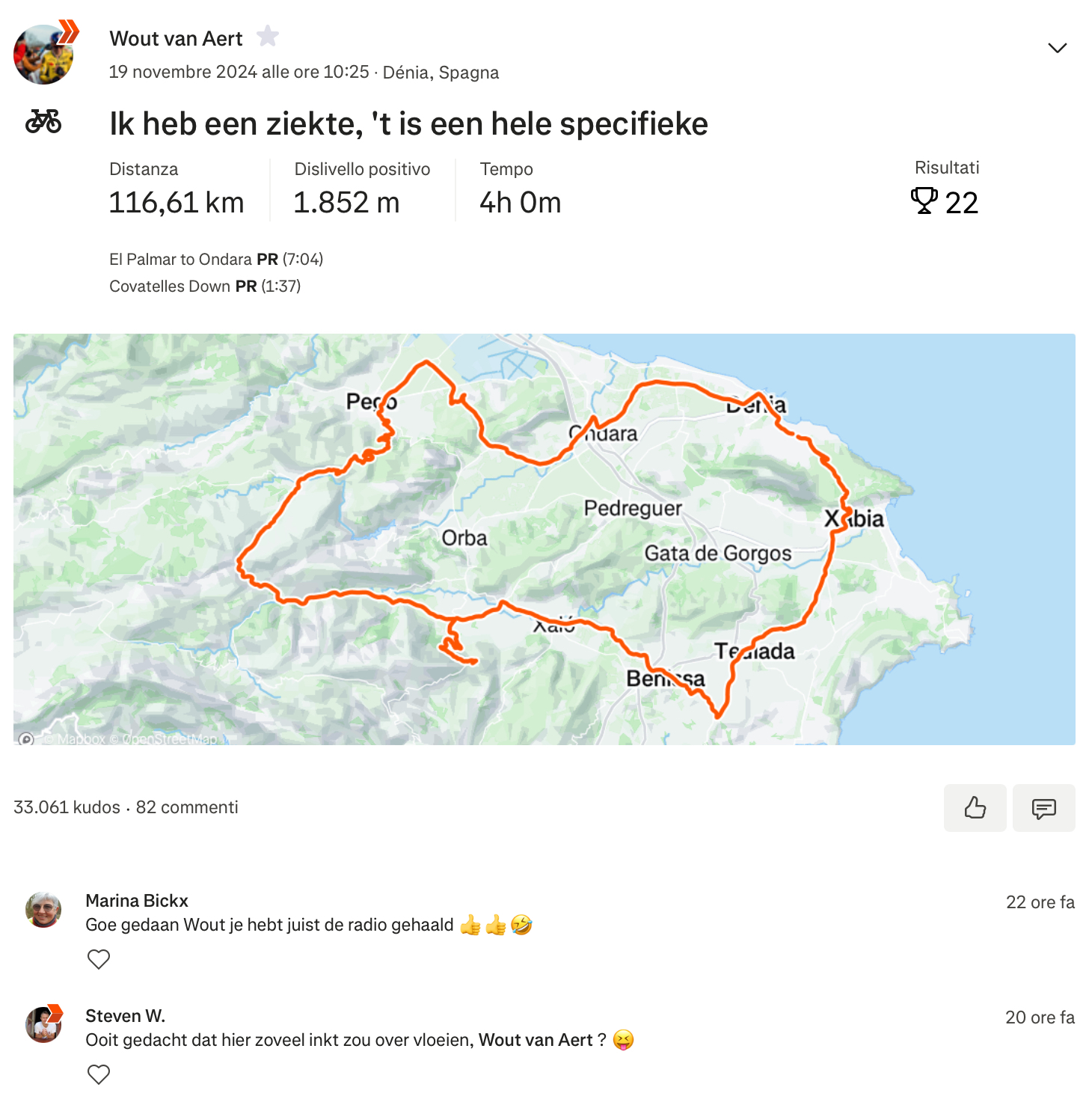 In un recente post, il ciclista belga ha condiviso un’uscita di oltre 116 chilometri, durata esattamente quattro ore. La didascalia scelta per il suo allenamento ha destato preoccupazione: “Ho una malattia, è una molto specifica.”