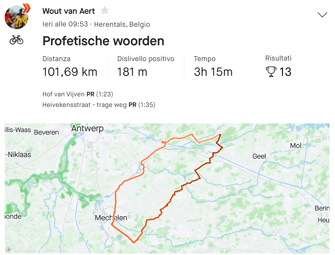 Poco più di tre settimane fa, il belga è riuscito a pedalare i suoi primi chilometri nella sua regione natale. Van Aert ha completato un giro di poco più di un’ora nella zona intorno a Herentals, percorrendo una distanza di 32,6 chilometri. “Woo-hoo,” ha scritto un Van Aert euforico sull’app di allenamento popolare Strava in quel momento.